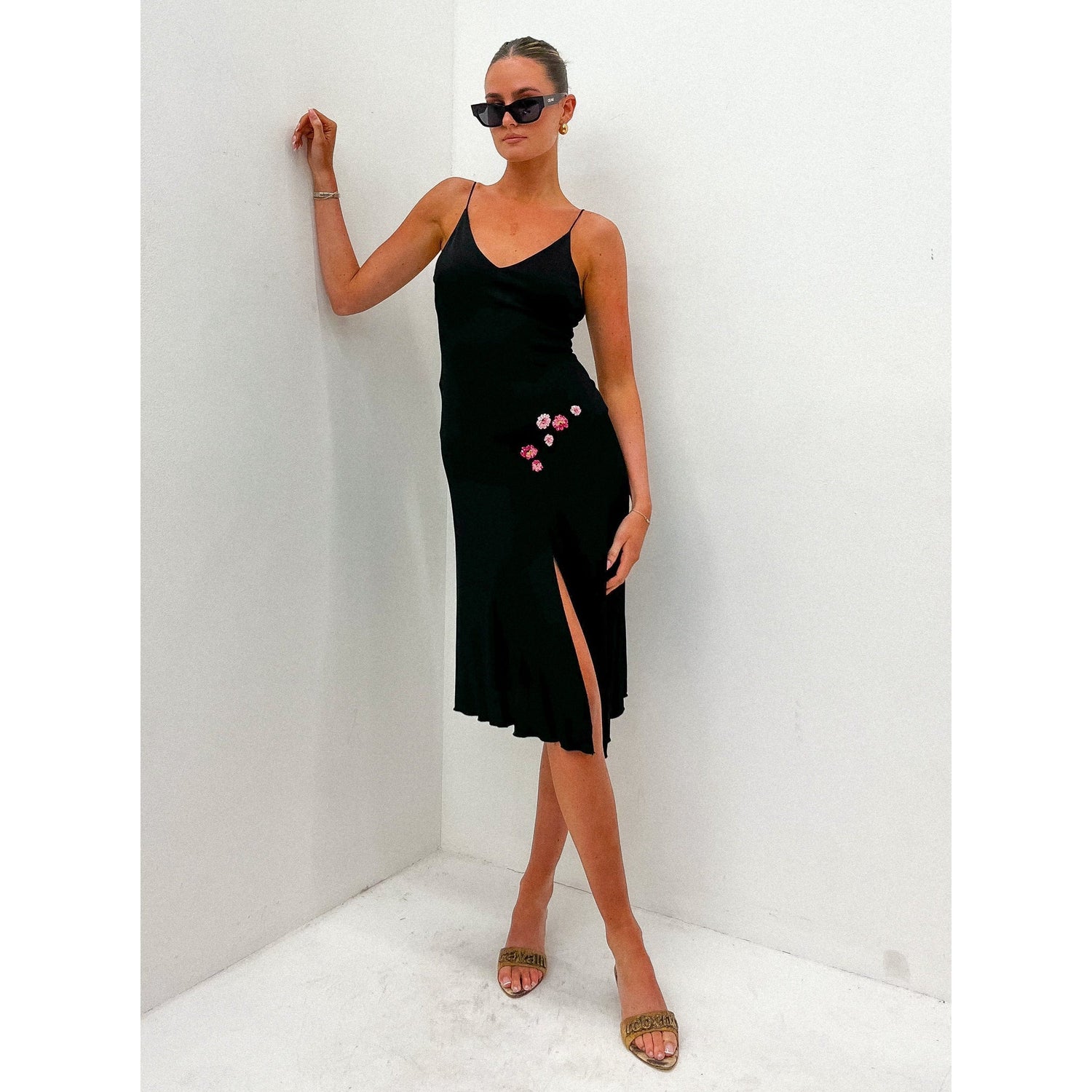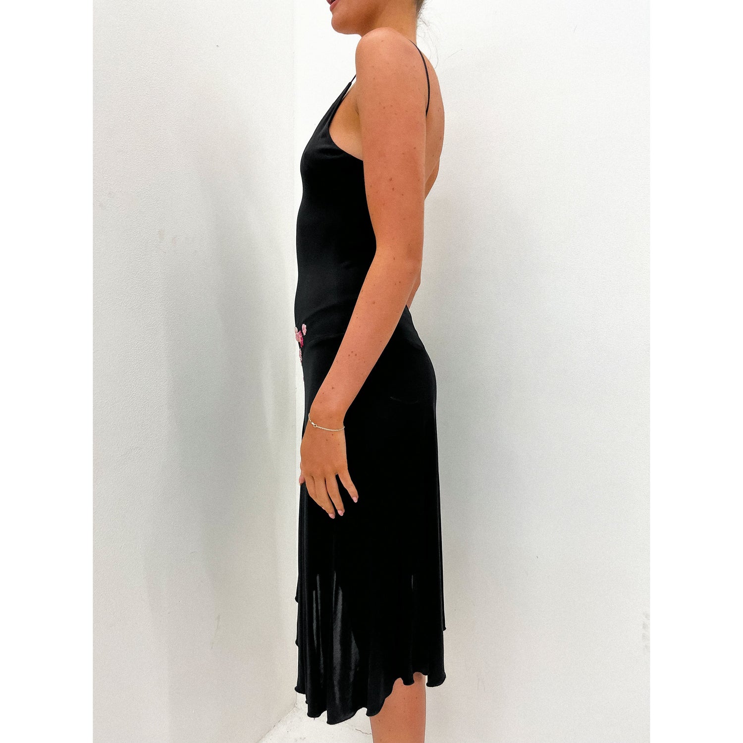 The Spring/Summer 2000 collection was inspired by traditional motifs, Indian-style embroidery and African zebra prints. This specific dress was not shown on the runway, but similar embellishments can be seen on other pieces in the collection. The style of the dress is iconic of the brand. Ebelished floral design on hip and spaghetti straps