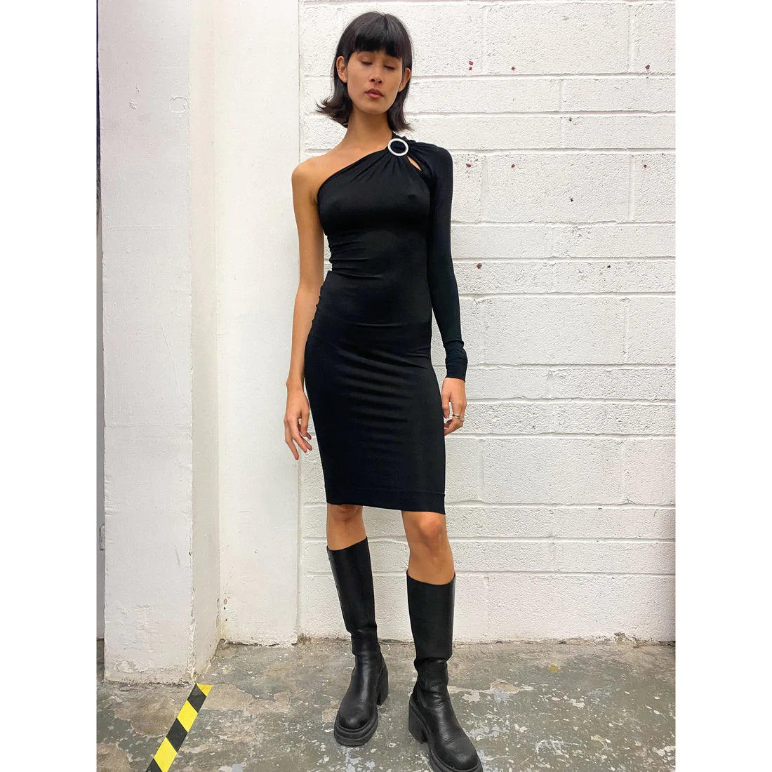 - Perfect one shoulder LBD from Just Cavalli. Silver buckle decorates shoulder with keyhole cut out, spandex feel stretch gives support, midi length.