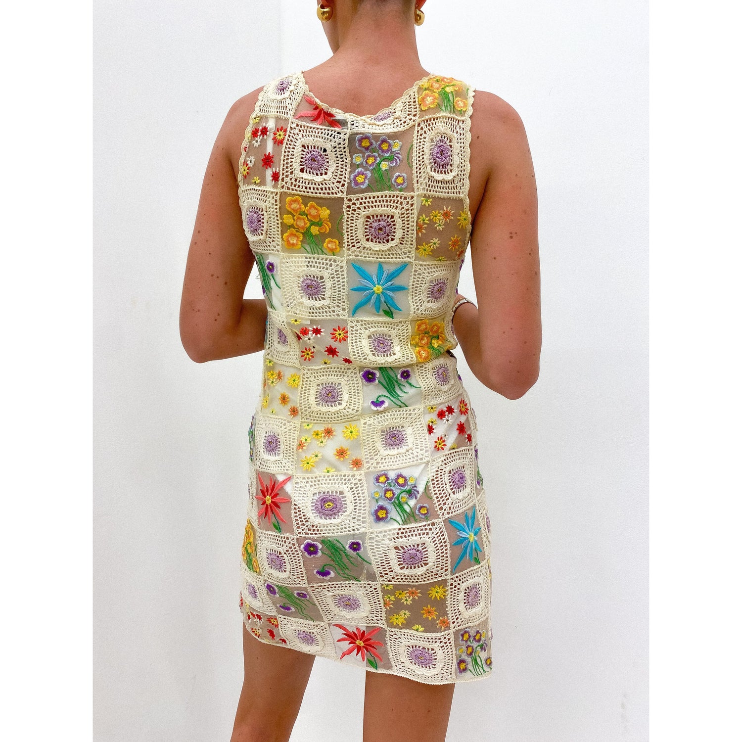 - Stunning vibrant crochet dress with embroidered floral designs on sheer fabric.